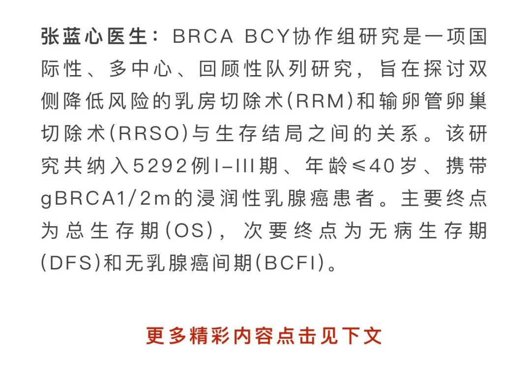 李曼教授:gBRCAm是导致年轻乳腺癌发生、发展的重要遗传因素。降低风险手术包括RRM及RRSO,已被证明可降低乳腺癌进展的风险,但对于生存结局是否获益仍未可知。这项大型国际、多中心研究的结果向我们展示了对于携带gBRCAm的年轻乳腺癌患者,这两种手术均有效降低了OS、DFS及BCFI的风险,显著改善了此类患者的生存预后。但值得注意的是,RRSO在携带gBRCA1m的乳腺癌患者中进行可能获益更多,而对于携带gBRCA2m患者获益的循证医学证据目前尚不充分。