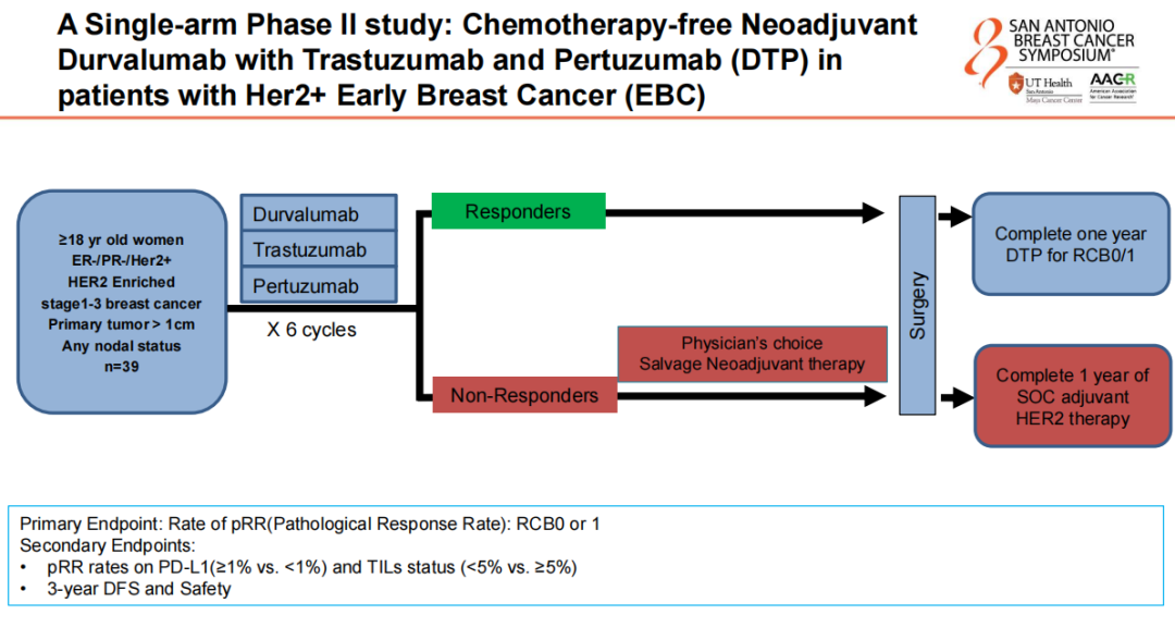 早期高危HER2阳性乳腺癌新辅助治疗现阶段主要是化疗联合抗HER2靶向治疗,保证病理缓解率的优化疗法一直在探索,免疫治疗与抗HER2的靶向治疗相结合的临床试验也在如火如荼开展。虽然免疫治疗在三阴性乳腺癌新辅助治疗领域取得了不菲的成绩,如KEYNOTE-522试验。KEYNOTE-756、CheckMate 7FL等临床试验结果也让我们看到了HR+/HER2-早期乳腺癌患者新辅助免疫治疗的可能性。但HER2阳性领域的免疫治疗结果却不尽如人意,如IMpassion050试验。DTP试验在此大环境下顺势而为又异军突起,旨在评估度伐利尤单抗的免疫治疗同双靶治疗相结合的去化疗方案在早期ER/PR-HER2阳性乳腺癌新辅助领域的疗效和安全性,以期找到精准医疗驱动下的HER2富集型乳腺癌治疗新方向。