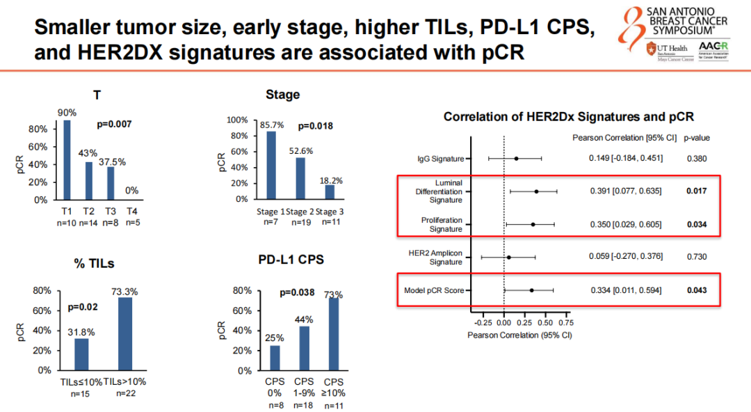 而后对这些患者进行pCR的多因素分析,结果显示与肿瘤大小、淋巴结转移状态、较晚分期呈负相关,与肿瘤浸润淋巴细胞TILs%和PD-L1联合阳性分数CPS呈正相关。HER2DX检测所确定的管腔型乳腺癌相关的基因表达也与pCR结果具有相关性。