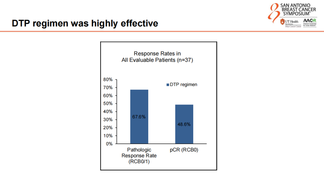 在所有可评估患者中,67.6%的患者达到病理缓解,48.6%的患者达到病理完全缓解pCR。
