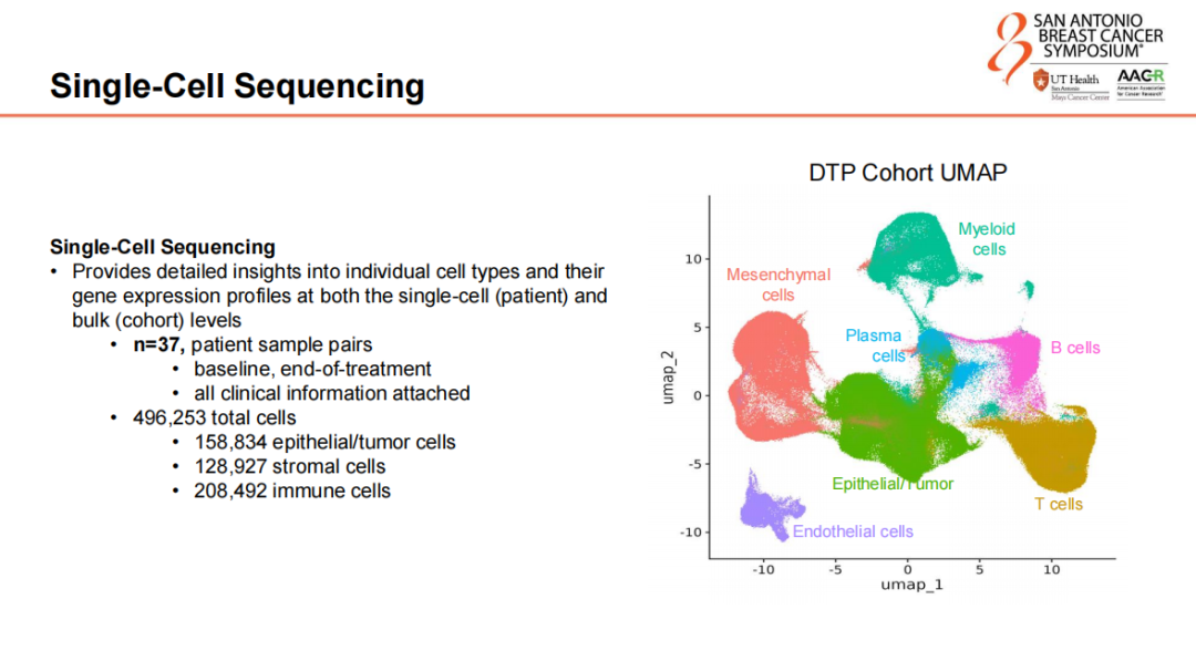 HER2DX检测所确定的管腔型乳腺癌相关的基因表达也与pCR结果具有相关性。该研究也利用治疗前、治疗结束的单细胞RNA测序和空间转录学组技术对肿瘤微环境和免疫细胞间的相互作用进行后续的探索,研究仍在进行中。