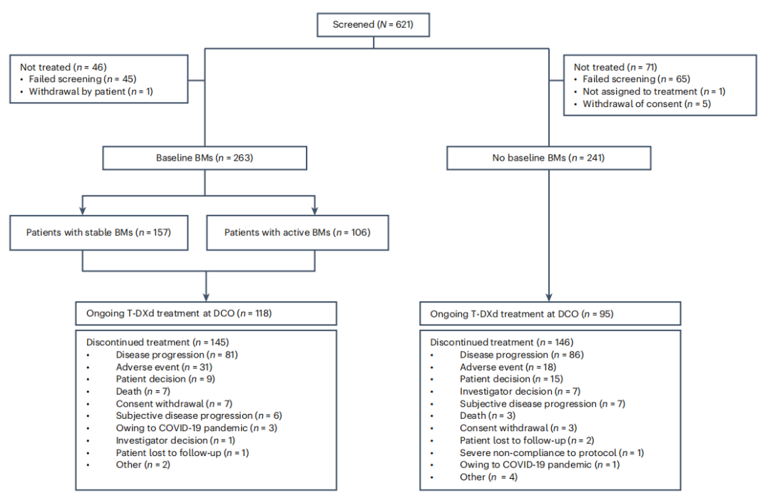 所有患者均接受至少一种抗HER2治疗方案后入组,并接受T-DXd静脉注射,每3周一次(21天一个周期),剂量为5.4mg/kg,直至出现根据实体瘤疗效评价标准1.1(RECIST 1.1)定义的疾病进展(颅外),或出现不可接受的毒性、撤回知情同意书或其他停药标准。主要终点为基线脑转移队列患者的PFS和无脑转移队列的ORR。次要终点包括CNS PFS、ORR、至第二次疾病进展时间、CNS ORR(脑转移队列)、新发有症状CNS转移的发生率(无脑转移队列)、至疾病进展时间、缓解持续时间、总生存期和安全性(两个队列)。