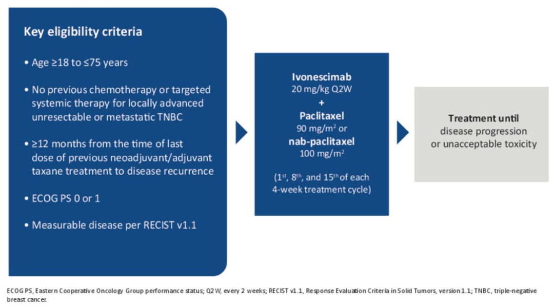 其一是欧阳取长教授与我共同牵头的一项PD-1/VEGF双特异性抗体依沃西单抗联合化疗一线治疗三阴性乳腺癌(TNBC)的临床研究(图1)[1]