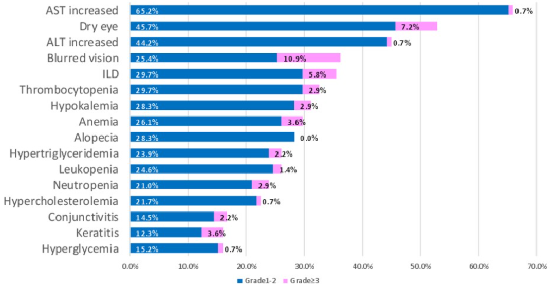 另外在安全性方面,该研究主要不良反应包括转氨酶升高及间质性肺炎(ILD),有1例患者因为TEAE死亡,其他患者经过对症管理后实现安全性可控,整体数据值得期待(图6)。