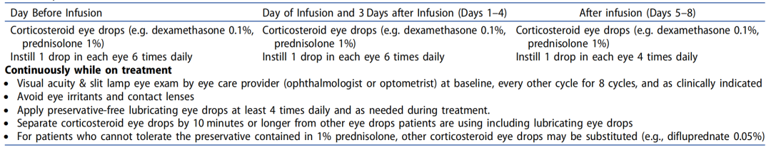 此外,治疗期间需要眼科提供基线时、每次输液前以及根据临床需要进行视力和裂隙灯眼部检查,患者应避免使用眼部刺激物和隐形眼镜,每天至少四次并根据需要使用无防腐剂的润滑眼药水,直至最后一次输液后30天。