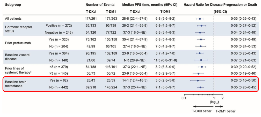 此外,DB-03研究还进行了亚组分析,发现T-DXd组非脑转移人群占83.5%,中位PFS为37.3个月;而脑转移人群占16.5%,中位PFS为14.1个月[2]。研究结果表明,T-DXd在非脑转移患者中的中位PFS获益相较于脑转移人群的数据更加显著。
