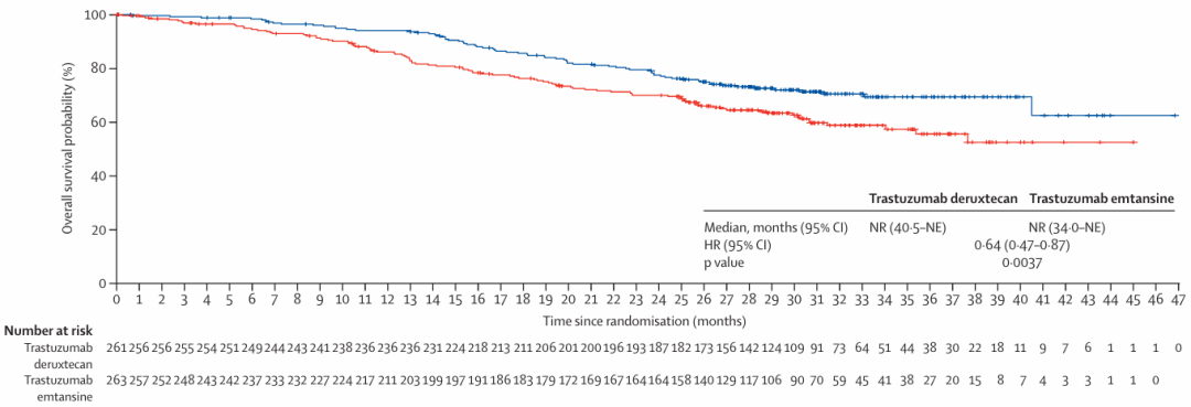 2024年ASCO大会进一步更新了这项研究的OS结果[3],显示T-DXd治疗可延长患者的OS至52.6个月,而T-DM1治疗组OS为42.7个月;风险比分析显示相较于T-DM1,T-DXd治疗可降低27%的死亡风险(95%CI 0.56-0.94)。