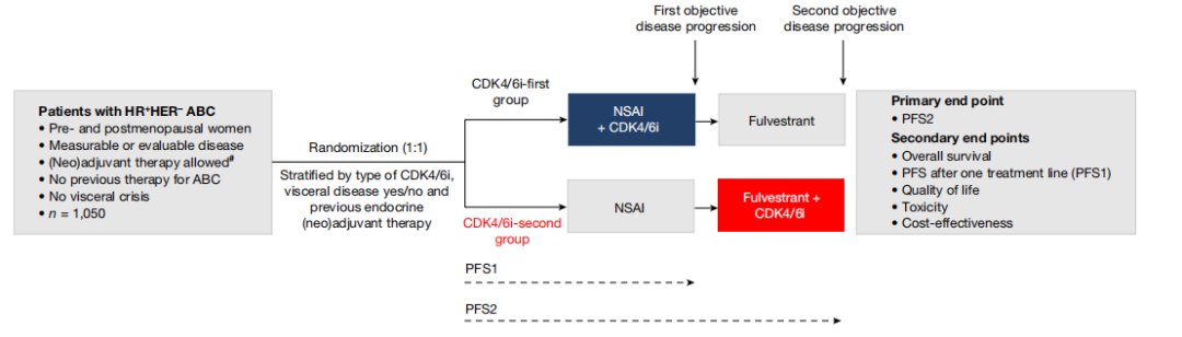 此外,SONIA研究也对CDK4/6抑制剂在一线治疗中的地位进行了挑战。SONIA是由研究者于2017年发起的随机、开放标签的III期研究,彼时CDK4/6抑制剂的临床应用为HR+晚期乳腺癌患者的治疗提供了强有力的证据,但CDK4/6抑制剂的最佳使用时机(一线或二线治疗)仍存在争议。因此,SONIA研究比较了一线与二线使用CDK4/6抑制剂+ET的疗效与安全性。患者以1∶1随机分为2组:一组一线使用CDK4/6抑制剂联合芳香化酶抑制剂(AI),进展后使用氟维司群;另一组一线使用AI,进展后使用CDK4/6抑制剂联合氟维司群。主要终点是从随机化至第2次疾病进展或因任何原因死亡的时间(PFS2)。