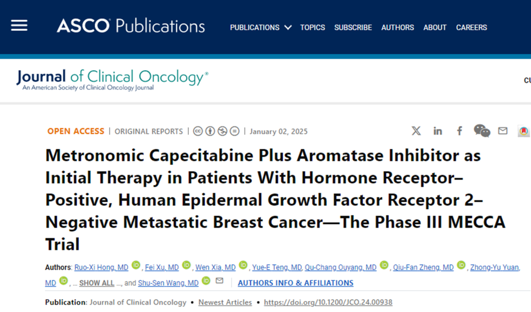 我们中心(中山大学肿瘤防治中心)牵头开展、全国12家研究中心共同参与的“卡培他滨节拍化疗联合芳香化酶抑制剂对比芳香化酶抑制剂单药作为一线治疗在HR+/HER2-晚期乳腺癌的疗效和安全性的III期临床研究”于2025年1月2日全文发表于《临床肿瘤学杂志》(JCO)。结果显示,节拍卡培他滨联合芳香化酶抑制剂能够显著延长患者的PFS和OS,同时也展示了良好的耐受性和安全性。该研究同样也给我们带来了另外一个维度的思考,同样由于历史原因,研究开始时CDK4/6抑制剂还未在我国获批用于HR+/HER2-晚期乳腺癌患者的一线治疗。该研究也给我们提供了另外一个维度的考虑,在临床实践当中,如果患者CDK4/6抑制剂不可及、患者不能耐受药物带来的不良反应或者患者经济条件不允许的情况下,卡培他滨节拍化疗可以作为新的治疗选择。