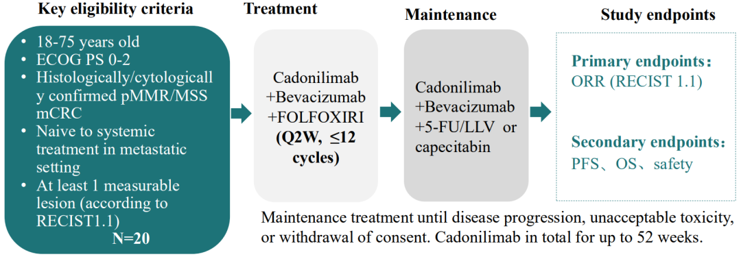 本研究对初治pMMR/MSS mCRC患者予以卡度尼利单抗+贝伐珠单抗+FOLFOXIRI一线治疗,继以贝伐珠单抗+卡度尼利单抗+5-FU/LLV维持治疗。主要终点为ORR;次要终点为PFS、OS和安全性(图4)。