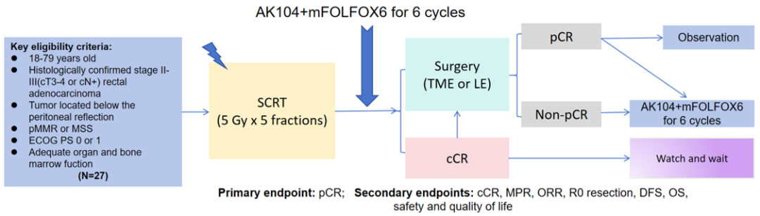 本研究对pMMR/MSS的Ⅱ-Ⅲ期直肠腺癌患者予以短程放疗(SCRT),随后使用卡度尼利单抗+mFOLFOX6方案新辅助治疗(图6),并根据患者状态实施手术或观察,部分手术患者继续辅助治疗。主要研究终点为pCR;次要研究终点包括临床完全缓解(cCR)、主要病理缓解率(MPR)、ORR、R0切除率、无病生存期(DFS)、OS、安全性和生活质量。