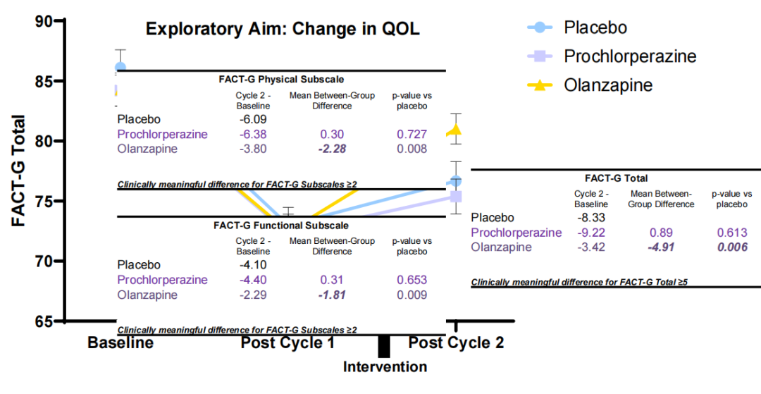 Prof.Luke Peppone:So in terms of safety profile,both of those drugs were excellent,and we had no serious adverse events related to the study intervention drugs,either olanzapine or prochlorperazine.We had a number of adverse events that were all expected.Olanzapine is known to cause sedation and some drowsiness,and those were the typical adverse events that we dealt with,similar with prochlorperazine,but nothing unexpected.And adverse events between the placebo and the study interventions were very similar.We’re still teasing apart those,but the safety profile of those two drugs in our study and in previous research are excellent,and that’s one of the many reasons why they were chosen,and we like using these drugs in these patients.