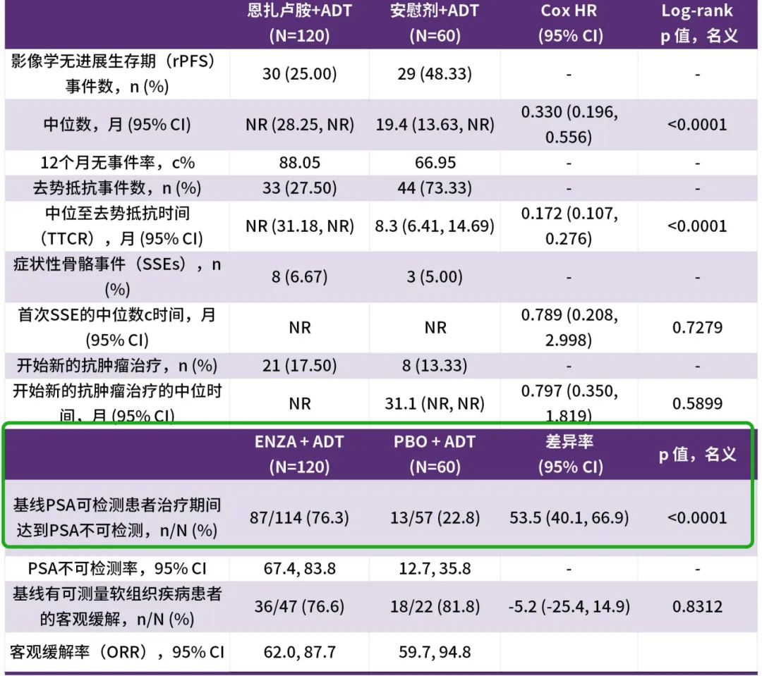 △China ARCHES研究:恩扎卢胺组和安慰剂组分别有76.3%和22.8%的患者达到PSA不可检测水平[12]
