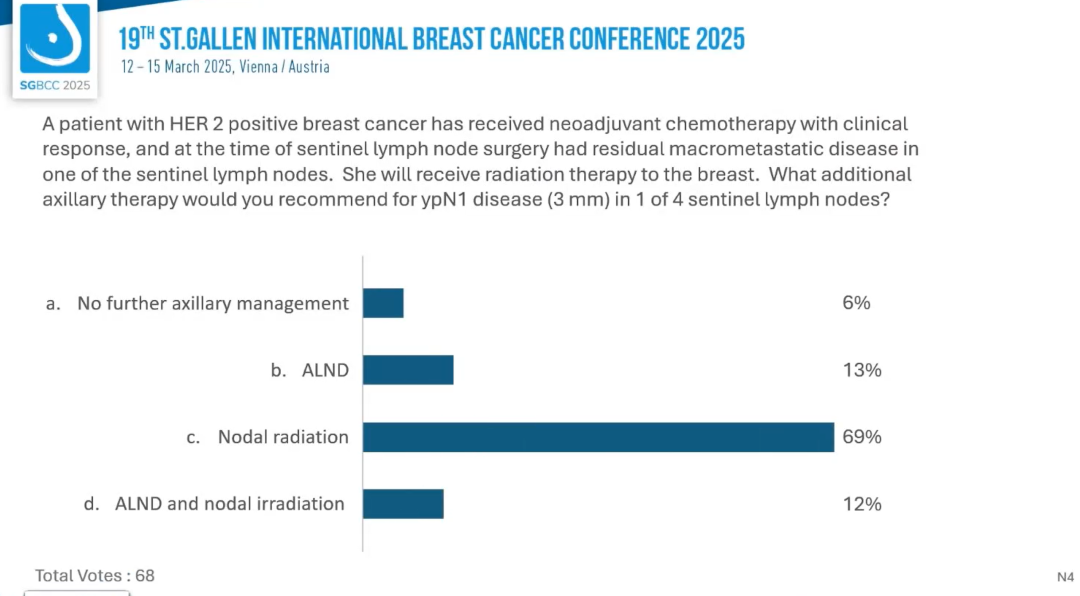 (7)某HER2阳性乳腺癌的患者接受了新辅助化疗并有临床反应,在前哨淋巴结手术时发现其中一个前哨淋巴结有巨块型残留病灶。她将接受乳房放疗。针对1/4枚前哨淋巴结的ypN1期疾病(3mm),您会推荐哪种额外的腋窝治疗?