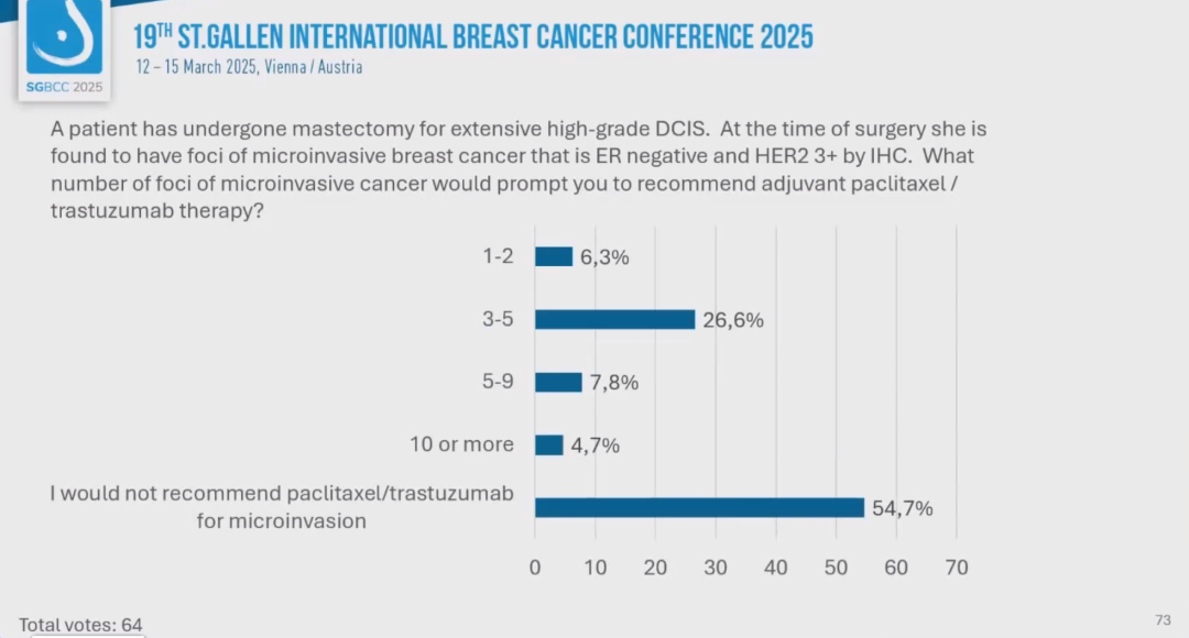 (1)一名患者因广泛性高级别导管原位癌(DCIS)接受乳房切除术。手术时发现其存在ER阴性、HER2免疫组化3+的微浸润性乳腺癌灶。出现多少个微浸润癌灶时需建议辅助紫杉醇/曲妥珠单抗治疗?
