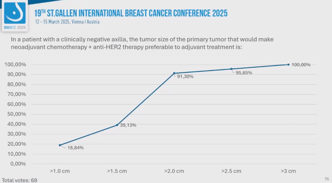 (3)对于临床腋窝淋巴结阴性的患者,若原发肿瘤达到以下大小,则新辅助化疗+抗HER2治疗优于辅助治疗: