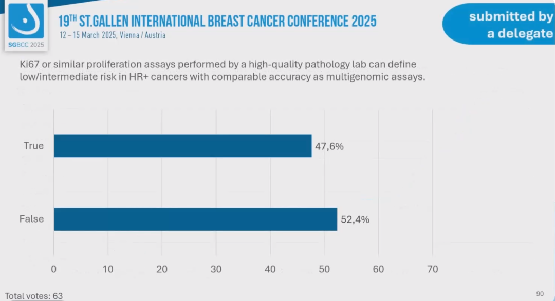 (4)由高质量病理实验室进行的Ki67或类似增殖检测,可定义HR+乳腺癌的低/中危风险,其准确性与多基因组检测相当。