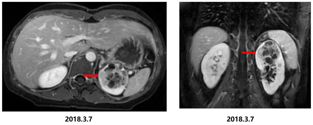 影像学检查:我院腹部增强MRI显示左肾上极占位病变,大小约为45x45x48 mm,考虑囊性肾癌可能性大。病灶未侵犯肾盂,未侵犯邻近血管,腹膜后未见肿大淋巴结。