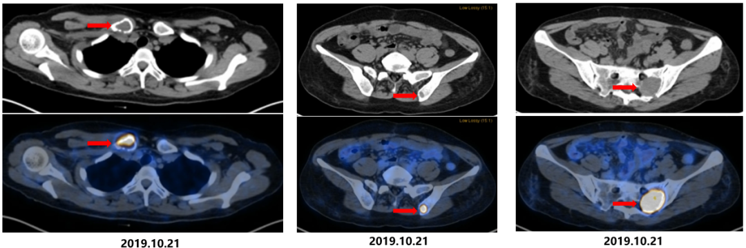 复查PET-CT:右侧锁骨、骶骨、及左侧髂骨局部骨质破坏并代谢活跃,考虑转移。