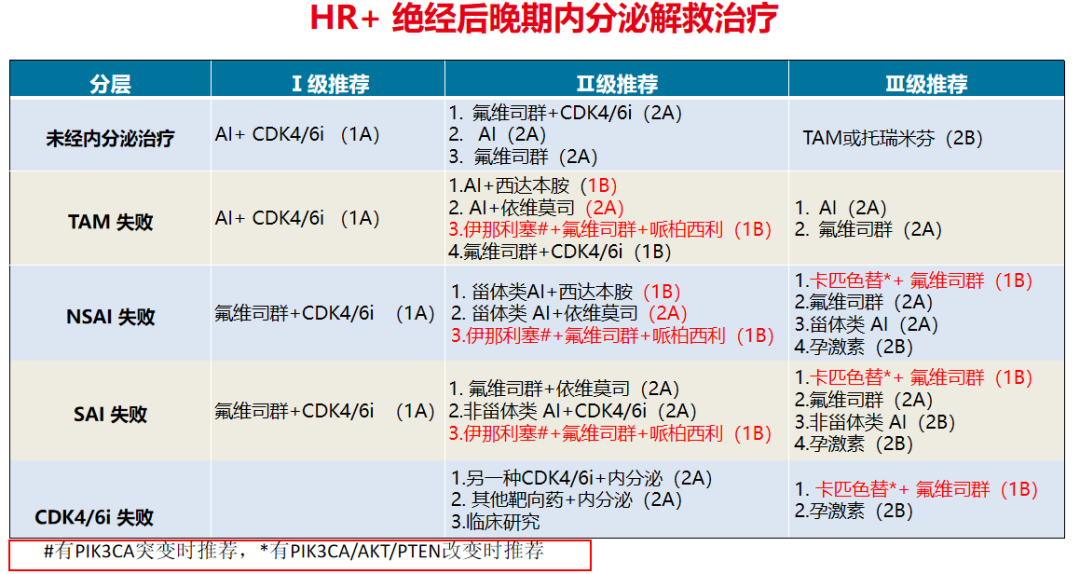 新版指南中最大的改变在于“TAM治疗失败、非甾体类AI治疗失败和甾体类AI治疗失败”患者的治疗选择路径,对于这些患者,除了CDK4/6抑制剂联合治疗外,还新增其他的靶向联合内分泌治疗推荐,如大家非常关注的PAM通路抑制剂,包括PI3K抑制剂伊那利塞等。在INAVO120研究中,伊那利塞联合哌柏西利和氟维司群展现了优异的临床效果,伊那利塞显著延长患者的中位PFS(15.0 vs.7.3个月,HR=0.43,P<0.0001),降低了57%的疾病进展或死亡风险。基于该研究数据和结果,3月11日,中国国家药品监督管理局(NMPA)正式宣布批准伊那利塞联合哌柏西利和氟维司群方案,适用于内分泌治疗耐药(包括在辅助内分泌治疗期间或之后出现复发)、PIK3CA突变、激素受体阳性、人表皮生长因子受体2阴性的局部晚期或转移性乳腺癌成人患者。