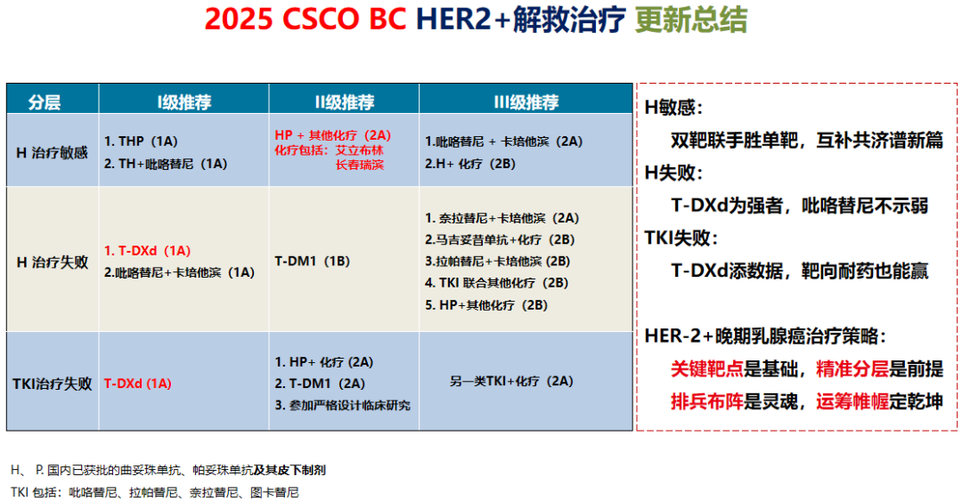 2025年《CSCO BC指南》HER2阳性晚期乳腺癌治疗推荐,依然采用分层治疗推荐,分为曲妥珠单抗敏感、曲妥珠单抗治疗失败以及TKI治疗失败等三个层次的选择,这种情况更贴近当前的临床治疗实践。