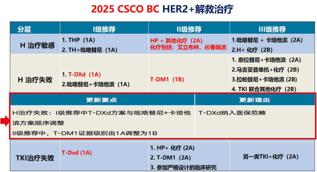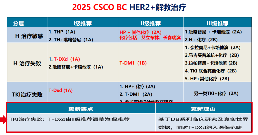 在Ⅱ级推荐方面,2024年指南中T-DM1为1A类证据,2025年《CSCO BC指南》将其调整为1B类证据,这体现了在治疗过程中,可优先选择T-DXd以及国产原研的吡咯替尼联合卡培他滨方案,T-DM1依然是次选。