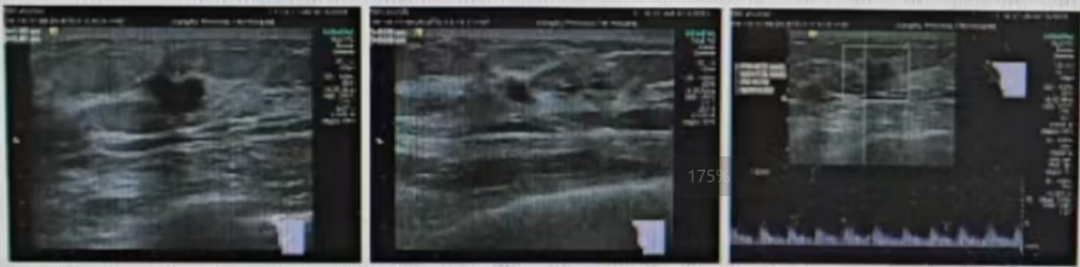 1、右乳9点见一个低回声区,大小约0.53*0.63cm,呈直立生长,边缘成角、毛刺,内部回声不均匀,肿块内未见强回声,BIRADS 5类;