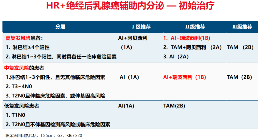 2、基于NATALEE临床研究及FDA已获批瑞波西利在辅助治疗的适应症:在高中风险分层中,II级推荐新增AI+瑞波西利治疗