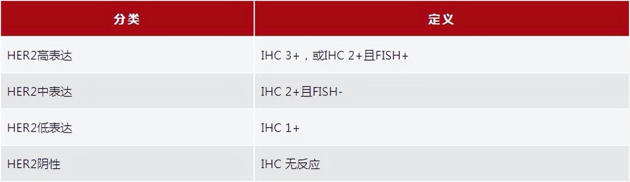 因此,新版《CSCO胃癌诊疗指南》不再简单地将胃癌患者区分为HER2阳性或阴性,而是进一步细分为HER2高表达、中表达、低表达和阴性四个层次(表1)。与此同时,指南还增加了其他靶向点的检测,例如错配修复蛋白(MMR)和微卫星不稳定性(MSI)状态的检测,这类患者可能需要免疫治疗而非传统化疗;此外,指南还纳入了PD-L1表达、Claudin 18.2表达等检测,这些生物标志物对指导不同药物的选择具有重要意义。