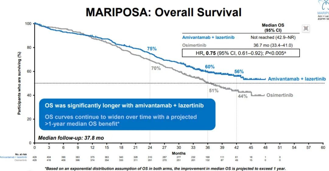 Dr.Perol:For the MARIPOSA trial,the overall survival analysis was presented at ELCC,showing that the combination of amivantamab and lazertinib was able to significantly improve median overall survival from approximately three years for osimertinib,to not reached for the amivantamab/lazertinib combination.The hazard ratio was 0.75.This is the first study to demonstrate that it is possible to improve overall survival for patients with EGFR mutation advanced non-small cell lung cancer since the FLAURA trial.So this is a great advance of course for the management of these patients.