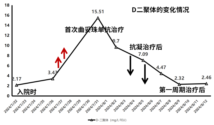 因患者入院后D-二聚体持续性升高,考虑患者肿瘤负荷大且血液高凝状态,有血栓形成的风险,2024-08-01查双下肢动静脉彩超:右侧髂外静脉及右侧股静脉内血栓形成(部分阻塞,范围约45mm*3.6mm)。经血管外科会诊后,予以“低分子肝素0.4ml ih Q12h”抗凝治疗,并双下肢制动1周。