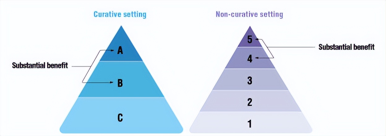 ESMO-MCBS仅用于实体瘤,由于治愈性疗法与非治愈性疗法之间存在较大差异,故对二者赋予不同评分形式。对于新辅助、辅助等根治性疗法,ESMO-MCBS将之分为A、B、C三个等级;对于非治愈性疗法,则分为1-5五个评分等级,其中4分和5分表明该疗法具有实质性获益[7]