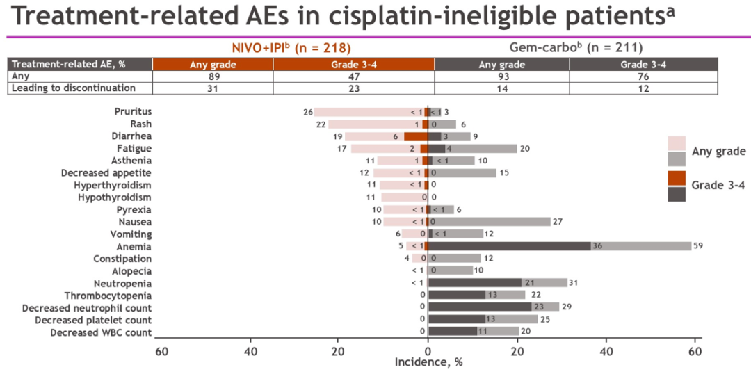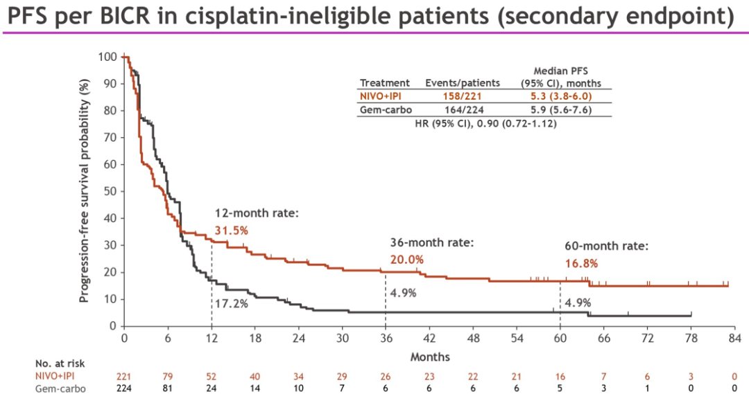 两种方案的无进展生存(PFS)也无显著差异(HR 0.90,95%CI 0.72-1.12)。中位PFS:纳武利尤单抗/伊匹木单抗方案为5.3个月,吉西他滨联合卡铂方案为5.9个月。