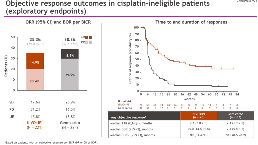 CheckMate-901是一项针对未经治疗、无法切除或转移性尿路上皮癌患者的3期临床试验。该试验纳入了不适合接受顺铂治疗的患者;这些患者被随机接受纳武利尤单抗联合伊匹木单抗方案治疗,随后接受纳武利尤单抗(221例)或吉西他滨联合卡铂方案治疗(224例)。