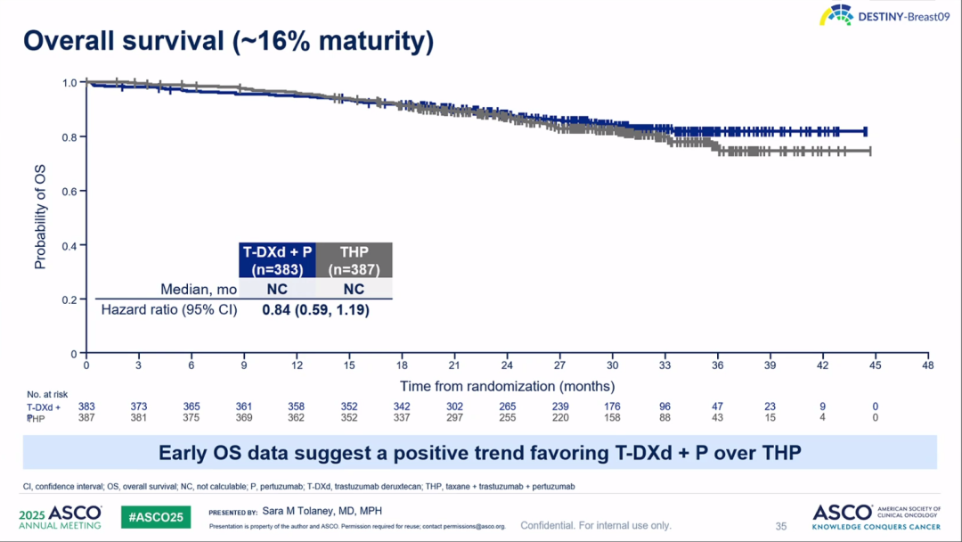 在OS方面,此次DESTINY-Breast09研究中期分析时的OS成熟度仅有16%,初步数据显示T-DXd+P有获益趋势(HR 0.84,95%CI:0.59-1.19),而且从生存曲线来看,随着时间的进行,两组OS的曲线的分离效果越来越大(图4),提示了未来T-DXd+P组将有更大的生存获益。