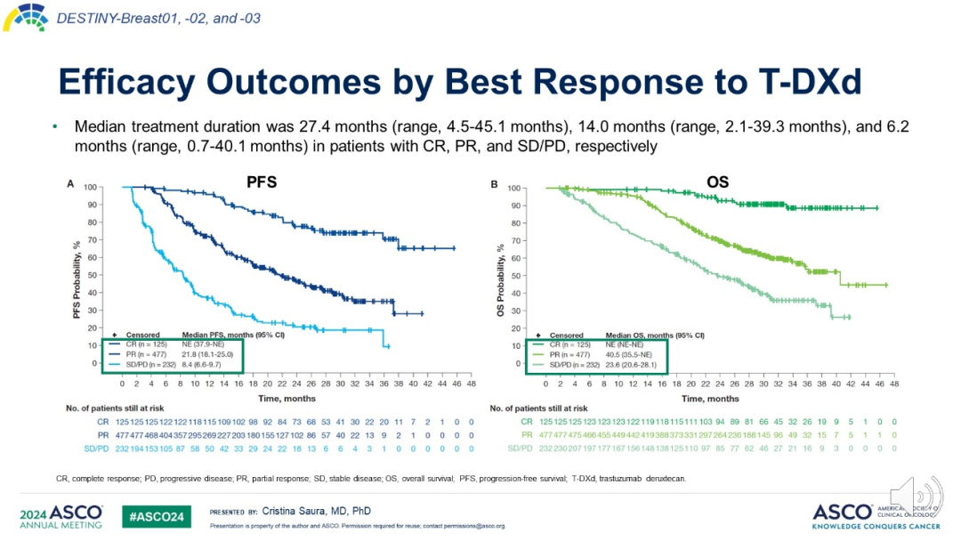 此外,DESTINY-Breast09研究还有众多可圈可点的数据。例如,化疗仍被视为快速缓解肿瘤负荷的首选药物,而DESTINY-Breast09研究中T-DXd+P同样突破了化疗客观缓解率(ORR)的极限(85.1%vs 78.6%),尤其是完全缓解(CR)率近乎翻倍(15.1%vs 8.5%)。已有循证医学证据证实,CR是HER2阳性晚期乳腺癌患者抗HER2治疗总生存(OS)获益的最强相关因素[6]。2024年ASCO报道DB-01/02/03的汇总分析显示,在CR、部分缓解(PR)、稳定或进展(SD/PD)三个亚组中,CR组的PFS和OS最长(图2)[7]。因此,DESTINY-Breast09研究中T-DXd+P组的高ORR和高CR率预示着更长的生存获益。