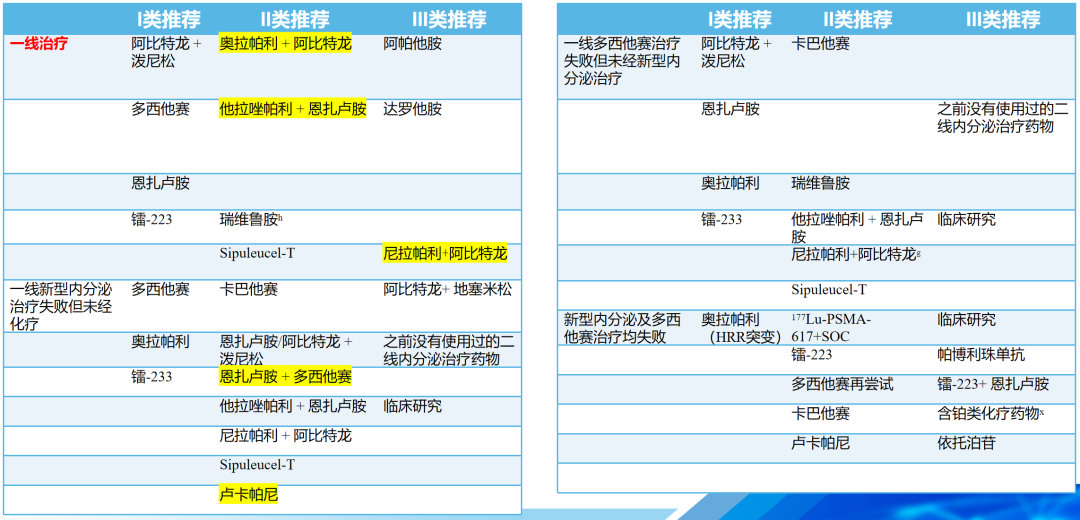 CACA-PC指南强调了内分泌治疗的基石作用,对于mHSPC患者不反对单独使用ADT,但是更加倾向ADT联合其他治疗。CACA-PC指南纳入了更多基于中国人群的循证医学证据,包括纳入了中国患者的ARASENS研究(ADT+多西他赛+达罗他胺)、CHART研究(ADT+瑞维鲁胺),均带来了显著的OS获益。此外,ADT+多西他赛+阿比特龙的PEACE-1研究也显示了同时对低或高瘤负荷患者的rPFS获益。