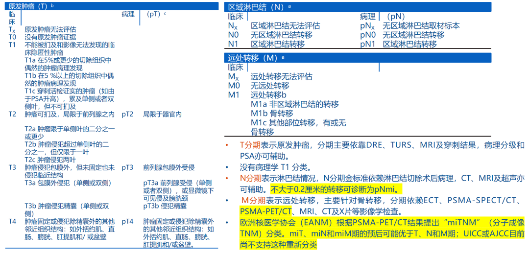 近年来,PSMA-PET检查已经被应用于前列腺肿瘤病灶的定位,包括原发病灶、盆腔淋巴结微小转移、远处淋巴结或骨转移病灶均显示较高的敏感性和特异性。复旦大学附属肿瘤医院团队利用68Ga-PSMA联合18F-FDG PET/CT的双重精准影像,对于传统影像未发现转移灶的nmCRPC患者,能够发现73%的患者具有转移灶。在新版CACA-PC指南的TNM分期注释中,纳入了基于PSMA-PET检查的pNmi和miTNM理念。