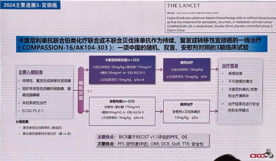 3.Xiaohua,Wu,Yang,Sun,Hongying,Yang et al.Cadonilimab plus platinum-based chemotherapy with or without bevacizumab as first-line treatment for persistent,recurrent,or metastatic cervical cancer(COMPASSION-16):a randomised,double-blind,placebo-controlled phase 3 trial in China.[J].Lancet,,404:0.