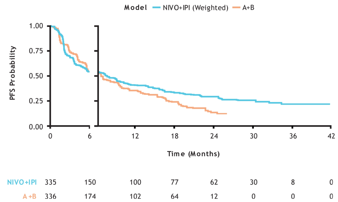 本研究关键挑战在于患者人群的异质性及不同研究间对照组的差异。基于CheckMate 9DW研究中N+I患者PFS和OS的Kaplan-Meier(KM)曲线梯度变化,以6个月为分割点,对PFS和OS进行分段MAIC分析。由于基线异质性存在,IMbrave150研究包含了门静脉侵犯Vp4患者,该人群预后较差,故敏感性分析排除了该人群。本研究使用Cox比例风险模型计算风险比(HR)和95%置信区间(CI),逻辑回归模型评估N+I组的加权ORR,基于CheckMate 9DW患者数据计算N+I的加权全因不良事件(AE)发生率,D+T/A+B的发生率源各自已经发表的数据。