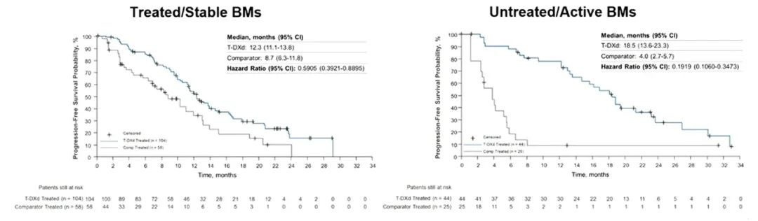 DB01、DB02和DB03研究的汇总分析[7]证实,德曲妥珠单抗(T-DXd)在HER2阳性乳腺癌脑转移患者中展现出显著的颅内抗肿瘤活性。在经治/稳定性脑转移亚组中,T-DXd组的CNS-ORR达45.2%(17例CR),显著优于对照组的27.6%(仅2例CR),中位CNS-PFS延长3.6个月(12.3个月vs 8.7个月)。而在未治/活动性脑转移患者中,T-DXd的疗效优势更为突出:CNS-ORR高达45.5%(7例CR)对比对照组仅12.0%(无CR),CR率显著提升(15.9%vs 0%),中位CNS-PFS延长14.5个月(18.5个月vs 4.0个月)(图3、图4)。安全性分析显示,T-DXd在脑转移患者中的耐受性良好,不良事件可控且与总体人群一致。此项汇总分析再次提示了T-DXd能够高效穿透血脑屏障并实现系统性颅内控制,为脑转移患者提供了兼具显著颅内疗效和可管理安全性的治疗选择,并改写了临床实践。