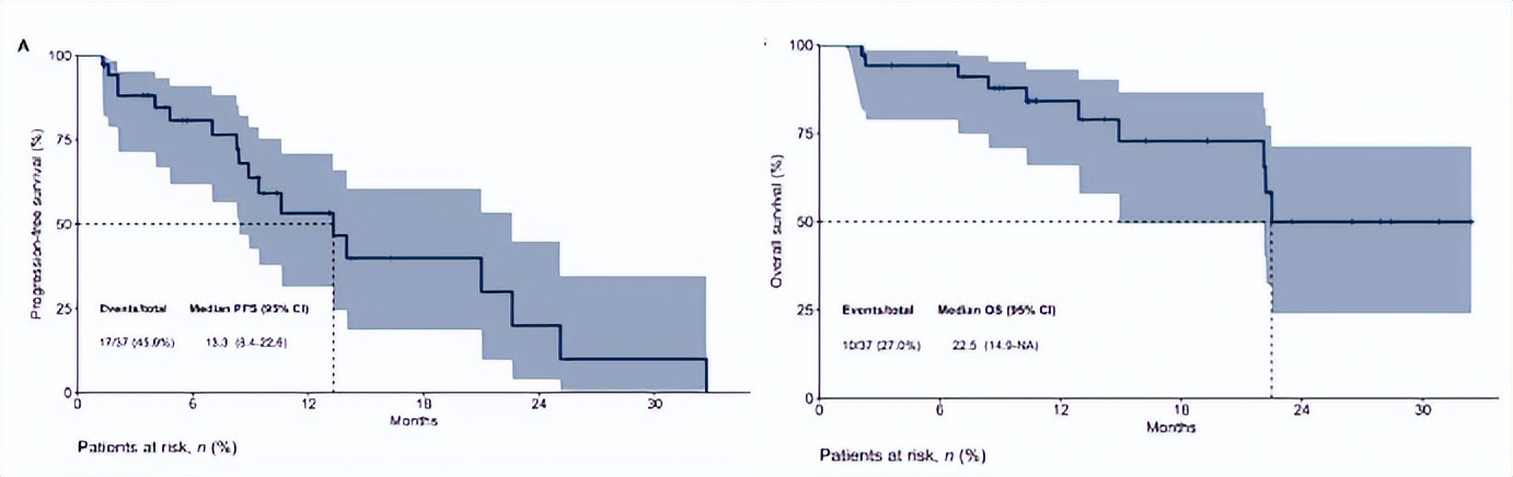 近期,DEBBRAH和TUXEDO-1的汇总分析[8]也进一步证实了T-DXd在伴活动性脑转移HER2阳性乳腺癌患者中的治疗效果纳。在两项研究可评估颅内反应的患者中,64.9%的患者为既往局部治疗后进展的脑转移患者,所有患者既往均接受过曲妥珠单抗治疗。经T-DXd治疗后,根据脑转移神经肿瘤反应评价标准(RANO-BM)评估的ORR-IC为64.9%,临床获益率(CBR)为81.1%,mPFS为13.3个月,mOS为22.5个月(图5、图6)。患者的生活质量在整个治疗期间保持稳定,且未发现新的安全性问题。该汇总分析的结果表明,T-DXd在接受过全身抗HER2治疗且伴活动性脑转移的HER2阳性乳腺癌患者中,具有可靠的颅内抗肿瘤活性。