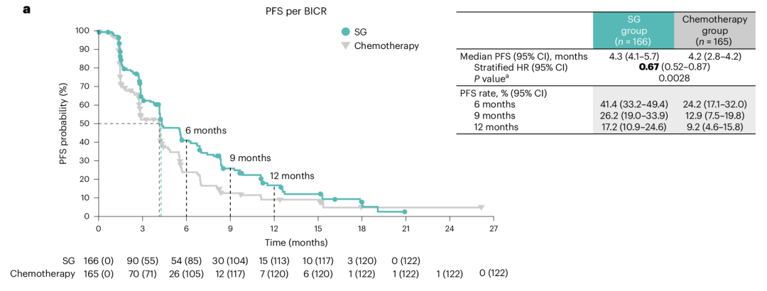 EVER-132-002研究[2]则针对以中国人群为主(中国大陆约70%)的亚洲患者,要求患者既往接受过2-4次系统性化疗,不限制既往CDK4/6i的应用(49%的患者为CDK4/6i经治)。结果显示,SG组较TPC组明显改善了BICR评估的mPFS,分别为4.3个月vs 4.2个月(HR 0.67;95%CI:0.52-0.87;P=0.0028),6个月(41.4%vs 24.2%)、9个月(26.2%vs 12.9%)和12个月(17.2%vs 9.2%)PFS率均显著提升近2倍,mOS分别为21.0个月vs.15.3个月(HR 0.64;95%CI:0.47-0.88;P=0.0061)。SG治疗组患者安全性和既往研究一致,主要以血液学毒性、腹泻为主,且SG治疗患者停药率低(3%),患者的生活质量显著提升,再次印证了TROPiCS-02研究结果。
