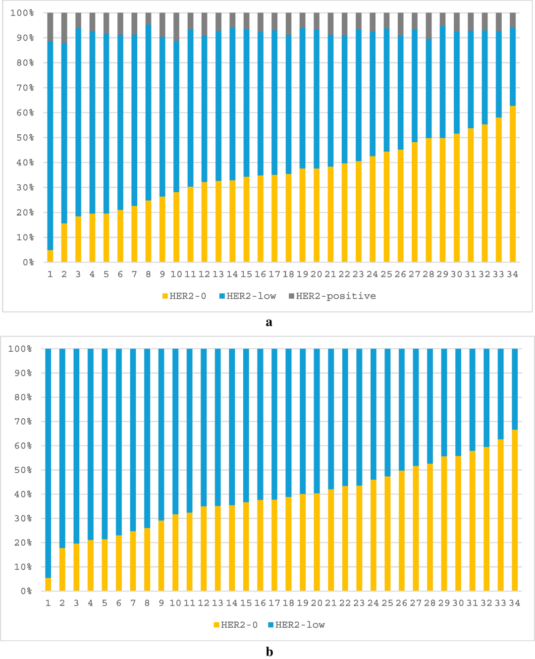 △各病理实验室乳腺癌病例(a)和非扩增乳腺癌病例(b)的HER2水平分布情况