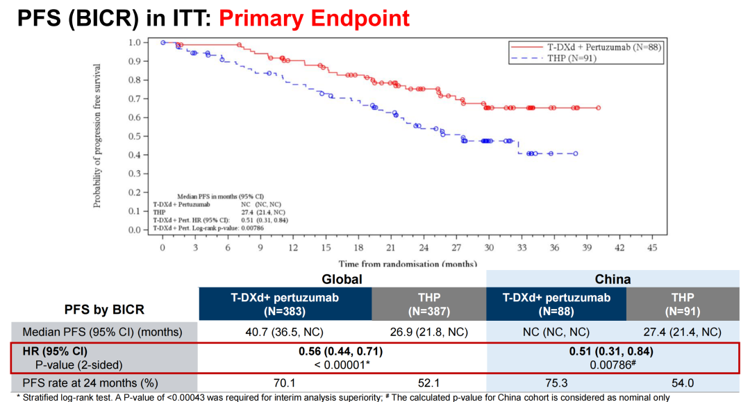 中国是人口大国,虽然从全球发病率情况来看,与欧美国家相比有自身的特点,但庞大的人口基数决定了我国患者数量众多,可为创新疗法的临床试验提供重要的数据支撑。DB-09研究入组了273例中国患者,我们贡献了非常重要的“中国数据”。近期报道的中国患者数据显示,T-DXd+P一线治疗在中国HER2阳性晚期乳腺癌患者中同样取得了显著的PFS获益,截至数据报道时仍未达到(NR),而对照组为27.4个月。中国人群接受T-DXd+P一线治疗展现了更大的获益幅度,疾病进展或死亡风险显著降低49%(NR vs 27.4个月;HR 0.51,95%CI:0.31~0.84,P=0.00786)。
