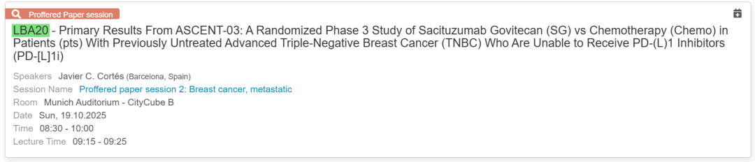 [12]Sara M.Tolaney,et al.Sacituzumab govitecan(SG)+pembrolizumab(pembro)vs chemotherapy(chemo)+pembro in previously untreated PD-L1–positive advanced triple-negative breast cancer(TNBC):Primary results from the randomized phase 3 ASCENT-04/KEYNOTE-D19 study.2025 ASCO LBA 109.