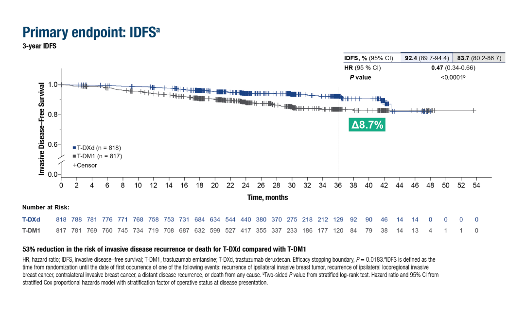该研究纳入了1635例在接受紫杉类化疗和抗HER2新辅助治疗后,存在残留浸润性病灶的HER2阳性且复发高风险的患者乳腺癌。结果显示,与T-DM1相比,T-DXd将无浸润疾病生存率(IDFS,主要终点)和无病生存率(DFS)改善了53%(两项指标的风险比<hr/>均为0.47;95%CI:0.34-0.66;P<0.0001)。