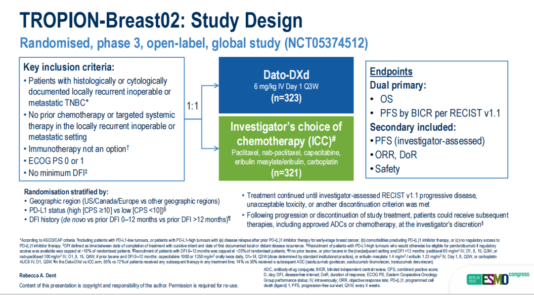 TROPION-Breast02是一项全球、随机、多中心、开放性Ⅲ期研究,旨在评估Dato-DXd与研究者选择的化疗方案(紫杉醇、白蛋白紫杉醇、卡培他滨、卡铂或艾立布林)在治疗不适合接受PD-1/PD-L1抑制剂治疗的既往未经治的局部复发无法手术或转移性TNBC患者中的疗效和安全性。其在非洲、亚洲、欧洲、北美洲和南美洲共入组了644例患者。其中入组患者包括PD-L1阴性肿瘤患者,以及虽为PD-L1阳性但因以下原因而无法接受PD-1/PD-L1抑制剂治疗的患者:疾病早期接受过PD-1/PD-L1治疗、合并症限制其使用、或在筛查时因地域性原因无法获得相关治疗。纳入的受试者包括初发或复发病例(无论无疾病间期长短),以及存在脑转移等不良预后因素的病例。