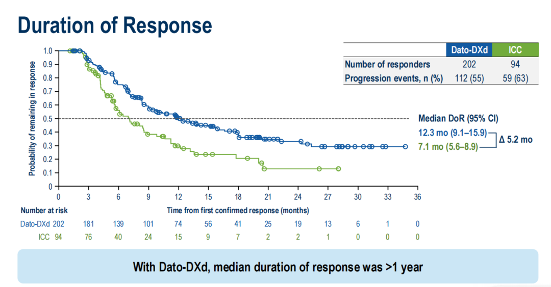 相较于ICC组,Dato-DXd组经证实的ORR是ICC组的2倍以上(62.5%vs29.3%),经证实的完全缓解率是ICC组的3倍以上(9.0%vs 2.5%)。使用Dato-DXd治疗的患者,中位缓解持续时间>1年。