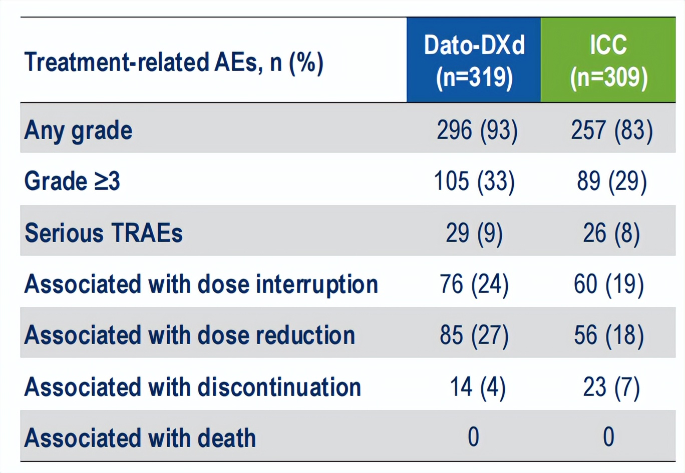 Dato-DXd组患者中位持续治疗时间为8.5个月(范围:0.7-38.0),ICC组患者中位持续治疗时间为4.1个月(范围:0.1-32.0),尽管Dato-DXd组的中位治疗持续时间是ICC组的两倍以上,但两组≥3级和严重治疗相关不良事件(AE)的发生率相似(33%vs29%),并且Dato-DXd组的停药率较低(4%vs7%)。